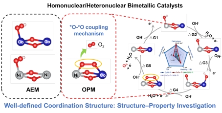 刘犇研究员、中国科学院化学研究所张闯研究员、香港中文大学(深圳)Daigo Miyajima教授合作,在游劲松教授的指导下,开发了一种由极性配体组装的双金属共轭配位聚合物单晶材料。极性配体与金属离子的一维聚合组装和二维堆积方式使得材料具有半导体性质、常温顺磁性及低温铁磁性。与近几年报道的非贵金属电催化析氧反应(OER)催化剂相比,该配位聚合物表现出超低过电位及较低的Tafel斜率。其精确的晶体结构为双金属协同催化构效关系研究提供了完美的研究模型,证明OER在异核和同核金属构型之间的反应途径差异,揭示氧化物路径机制在OER中的优势,为构建新型高效电催化剂提供了设计思路。