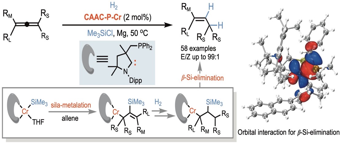铬金属作为地球丰产金属之一,在炔烃的选择性半氢化(Nat. Commun., 2023, 14, 990)和硝基化合物的脱氧硼氢化反应(J. Am. Chem. Soc., 2021, 143, 1618)中表现出优异的催化性能。在这些前期研究基础上,曾小明团队以富电的单氨基卡宾-膦-铬配合物为催化剂、氯硅烷为添加剂,实现了多取代联烯的无导向半氢化反应,区域、立体及化学选择性地生成双或三取代反式烯烃。研究表明,单氨基卡宾-膦-铬催化剂首先与氯硅烷反应,生成相应的硅基-铬(I)作为催化活性物种,促进了联烯的高选择性半氢化反应。通过高分辨质谱、X-射线光电子能谱、磁矩和电子顺磁共振等手段表征了该硅基-铬(I)催化活性物种。理论研究表明单氨基卡宾配体可利用它的空p轨道促进氢转移,协助联烯发生硅金属化、氢转移、氢金属化及β-硅消除反应生成相应的反式烯烃。这为开发有效的硅基配体促进丰产金属催化氢化提供了研究线索,深化了对硅基配体协同催化机制的认识。