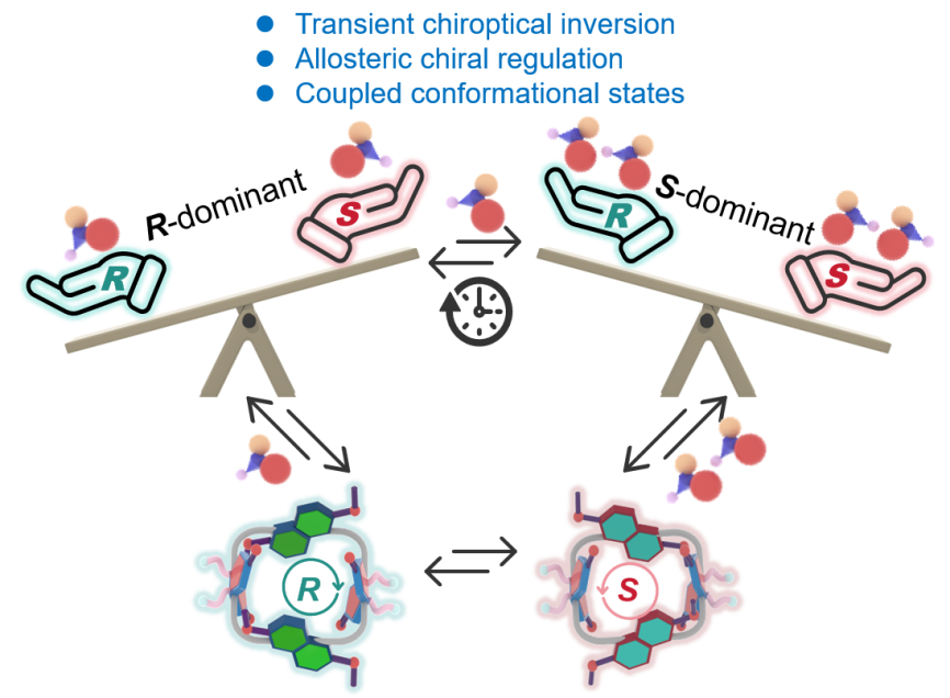 近日,杨成/伍晚花团队和李坤团队合作,合成了一类新型甘脲-萘基杂化大环(NGU [n,n]),其中 NGU[2,2] 具备可互变的 RP、SP 构型及内消旋构型,其平衡可被氨基酸衍生物的逐步结合扰动,形成的 1:1 和 1:2 主客体复合物会触发独特圆二色(CD)响应,第二次结合还能实现手性偏好反转,达成主客体体系中前所未有的手性变构调控,而时间分辨 CD 测试更捕捉到信号翻转等瞬态反转现象,内消旋构型在此过程中发挥关键作用,这一发现不仅是首个表现出时间分辨手性光学反转的主客体络合体系,更为超分子聚合之外的路径复杂性研究提供了全新思路。这意味着,未来我们有可能设计出能够在特定时间点响应特定刺激的分子材料,能够根据输入顺序做出不同输出的分子逻辑元件,甚至能够模拟生物系统中复杂信号处理模式的人工化学神经元。