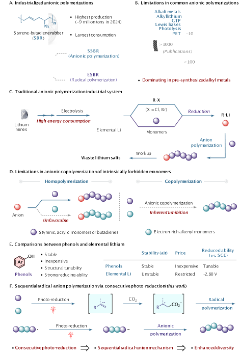 自由基聚合与阴离子聚合是合成橡胶、通用塑料及功能高分子材料的核心方法,但其应用仍均存在一些局限。自由基聚合对α-烯烃反应活性低,并且对苯乙烯和丁二烯的聚合速率远低于丙烯酸类单体;而传统阴离子聚合高度依赖高活性金属试剂(如有机锂化合物),存在合成能耗高、安全风险大及金属资源难以回收等问题。此外,不同电子性质单体的共聚也因反应活性差异而存在固有困难,限制了聚合物结构与性能的多样化。因此,开发一种不依赖金属试剂、可兼容多种单体的聚合新方法,对推动高分子合成化学的发展具有重要意义。
