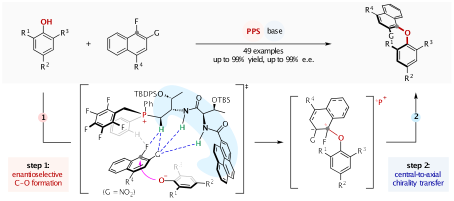 王天利教授团队与中国科学院上海有机所薛小松研究员团队合作,在这一挑战性研究领域取得重要突破,相关成果发表于《自然•催化》(Nature Catalysis)。研究团队创新性地发展了一类基于仿生手性肽季鏻盐(PPS)的有机催化新策略,成功实现了由亲核芳香取代(SNAr)反应介导的阻转选择性C–O键构筑(图1c)。该策略充分发挥了PPS催化剂独特的结构优势:其柔性肽骨架赋予的构象自适应能力与鏻盐中心的正电性协同作用,构筑了高度专一的手性微环境。催化剂通过氢键与离子对等多种非共价相互作用,协同活化大位阻酚类亲核试剂与芳基卤化物亲电试剂,有效抑制背景反应,并在高度拥挤的空腔环境中精准调控底物的相对取向,从而实现了反应活性与对映选择性的统一。这一工作为轴手性二芳基醚的精准、高效不对称合成提供了全新范式。