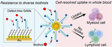 李峰教授团队联合四川大学华西医院与湖南大学合作团队,通过在DNA修饰的金纳米颗粒表面构建完美硫醇单分子层,构建了超稳定的纳米分子探针,可以有效抵御生物硫醇攻击,从而能够在全血中保持结构和功能的稳定性。通过系统研究探针在全血中的细胞选择性,研究团队成功实现了全血中白血病关键基因融合mRNA的细胞选择性分析,并进一步研发出在室温下可长期储存的冻干试剂。该试剂可与全血直接混合,在一小时能实现临床血样中基因融合的快速一步分析,从而实现血液癌的精准分子分型。